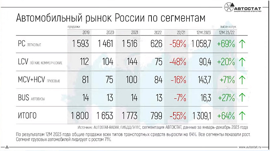 Ruski Autostat je sumirao rezultate prodaje automobila na ruskom tržištu u protekloj godini. Za samo dvanaest meseci u zemlji je prodato 1 milion i 309 hiljada novih automobila različitih klasa (uključujući kamione i autobuse), što je 64% više nego u katastrofalnoj 2022. godini.