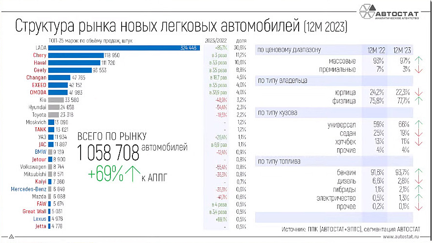 Ruski automobili su 2023. godine zauzimali 32% tržišta: to su Lade (324.446 jedinica) i UAZ (11.934 jedinica). A kineski automobili (uključujući lokalne brendove Moskvich i Evolute) činili su skoro 53% potražnje, iako 2022. njihov udeo nije premašio 20%. Preostalih 15% na kraju godine čine evropski, japanski, korejski i američki automobili, koji su ostali na ruskom tržištu uglavnom zbog nezvaničnih isporuka. Štaviše, njihov udeo nastavlja da opada: na primer, u decembru je bio samo 8%.