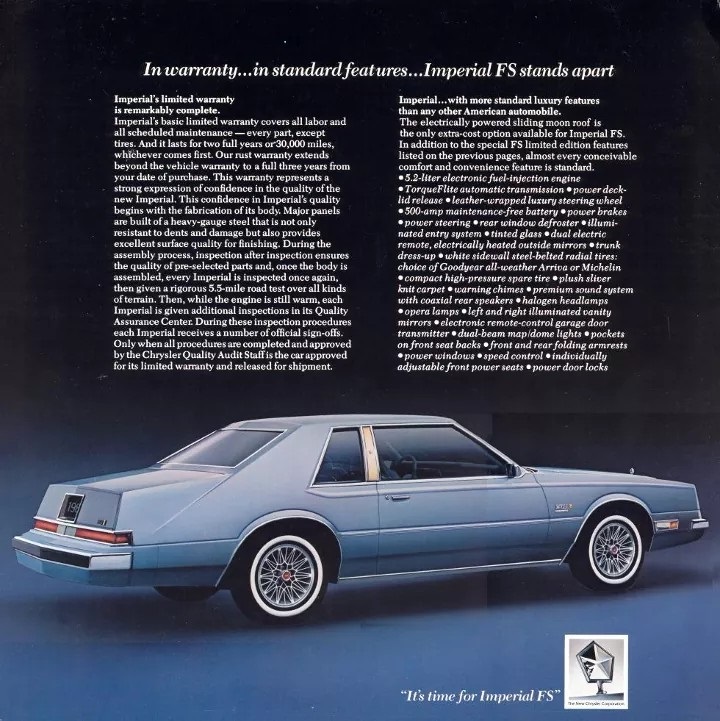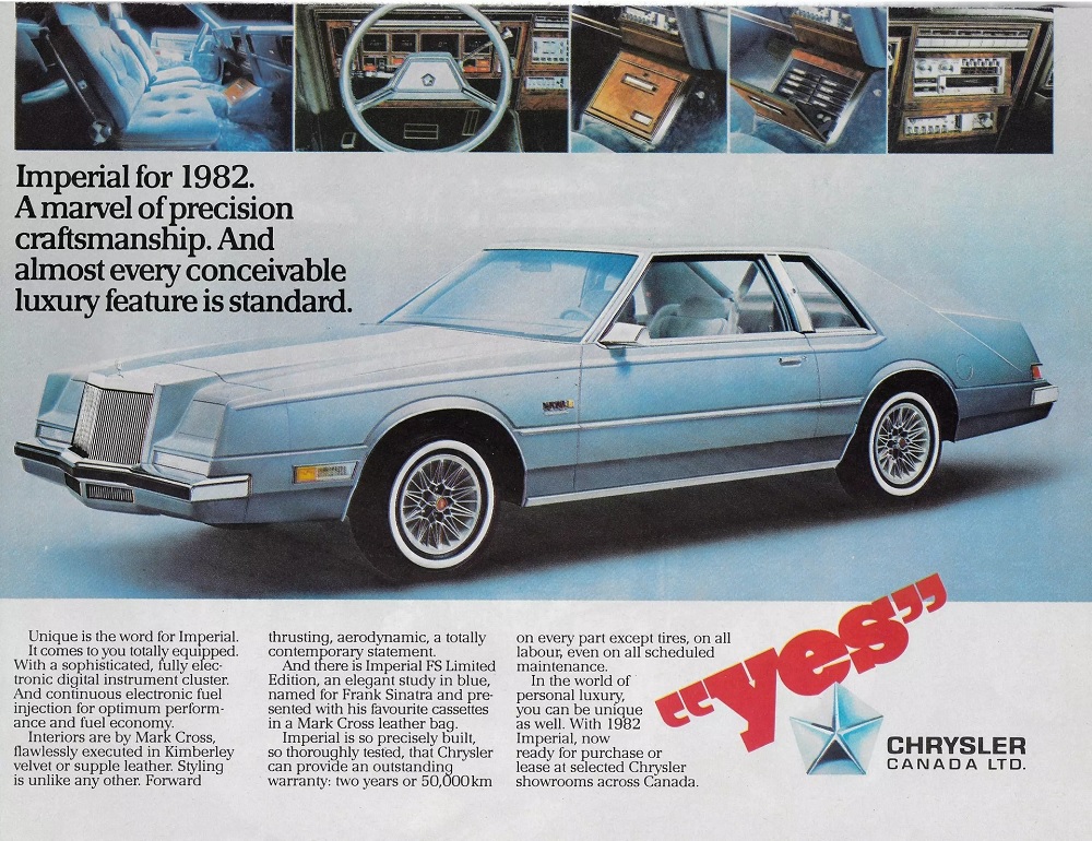 Čuveni muzičar i glumac će kasnije reći da je pristao da snimi reklamu ne zbog novca ili samog automobila već zato što je bio impresioniran time kako je Ajakoka spasio firmu i sačuvao radna mesta za toliko zaposlenih. Imperial je takođe ponudio tada nečuvenu garanciju i „besplatno“ održavanje (zapravo uračunato u cenu vozila) u trajanju od dve godine.