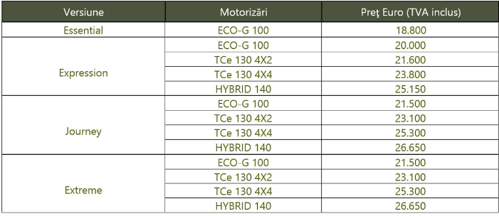 Cene počinju od 18.800 evra (sa rumunskim PDV-om) za verziju Essential ECO-G 100, a idu do 26.650 evra (sa PDV-om) za verzije Extreme i Journey opremljene motorom HYBRID 140.