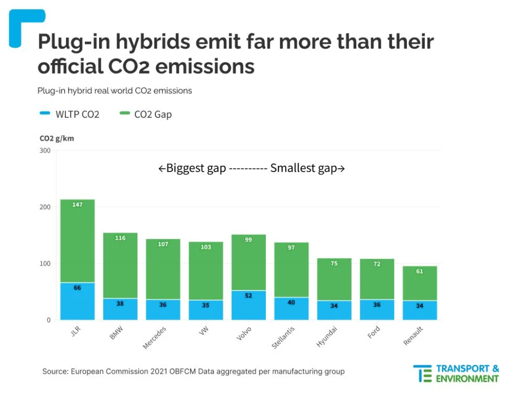 U julu 2022, NVO Transport & Environment je oglasila alarm. Prema njihovoj studiji, hibridni plug-in automobili (koji kombinuju termički motor i električni motor sa baterijom) zagađuju tri do pet puta više u odnosu na podatke koje daju proizvođači. U pitanju su navike vozača, često u kontekstu službenog automobila, koji su malo ili nimalo punili bateriju svog vozila.