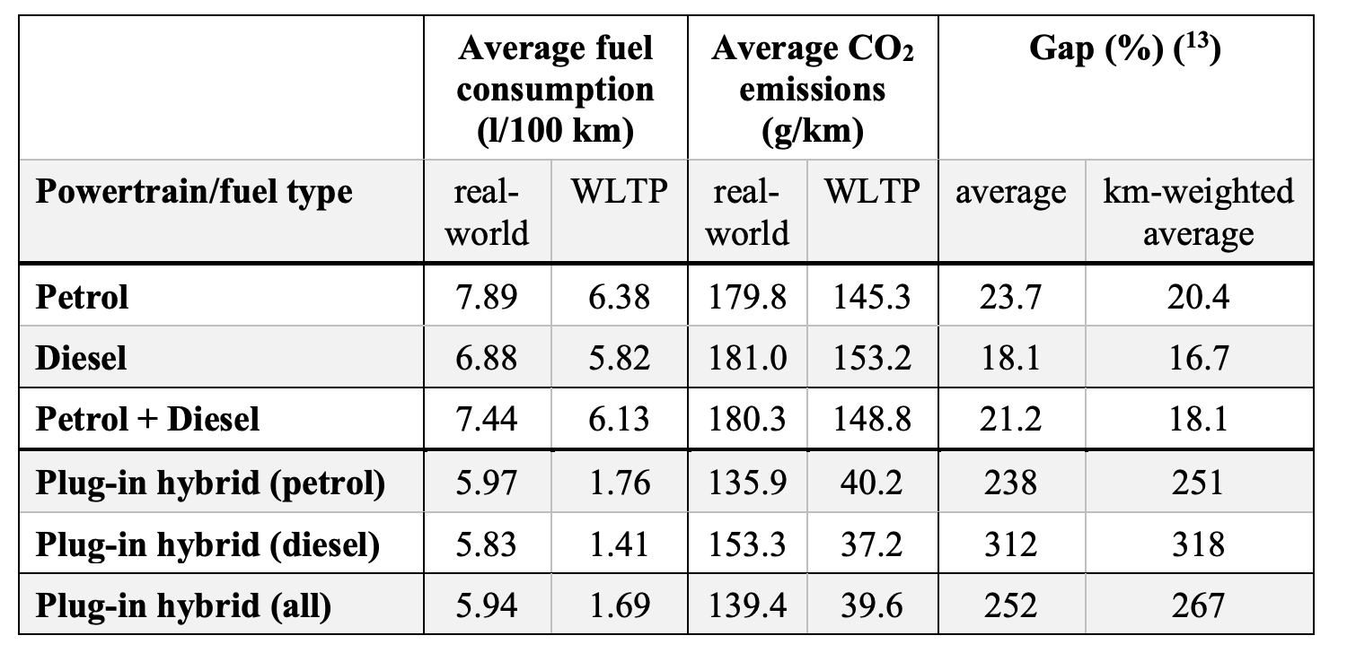 Poređenja radi, za nove automobile prodate 2021. Evropska komisija najavljuje prosečnu stvarnu potrošnju od 7,44 l/100 km za čisto termičke motore (benzin ili dizel), dok su teorijski podaci naveli potrošnju od 6,13 l/100 km za ove iste automobile.