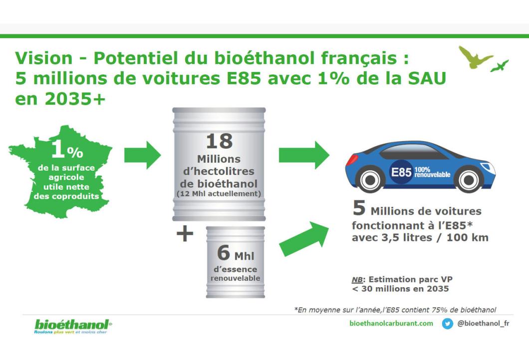 Cilj koji teži bioetanolski kolektiv nije da se direktno takmiči sa električnim vozilima. „Mislimo da je to veliki deo rešenja“, kaže Silvain Demoures, generalni sekretar Bioethanol France (ranije SNPAA). Ko dodaje: „Ali 100% električna energija nam se ne čini optimalnom. Veruje se da će biti oko 20 odsto vozila koja će morati da budu i elektrifikovana i da rade na tečna goriva.