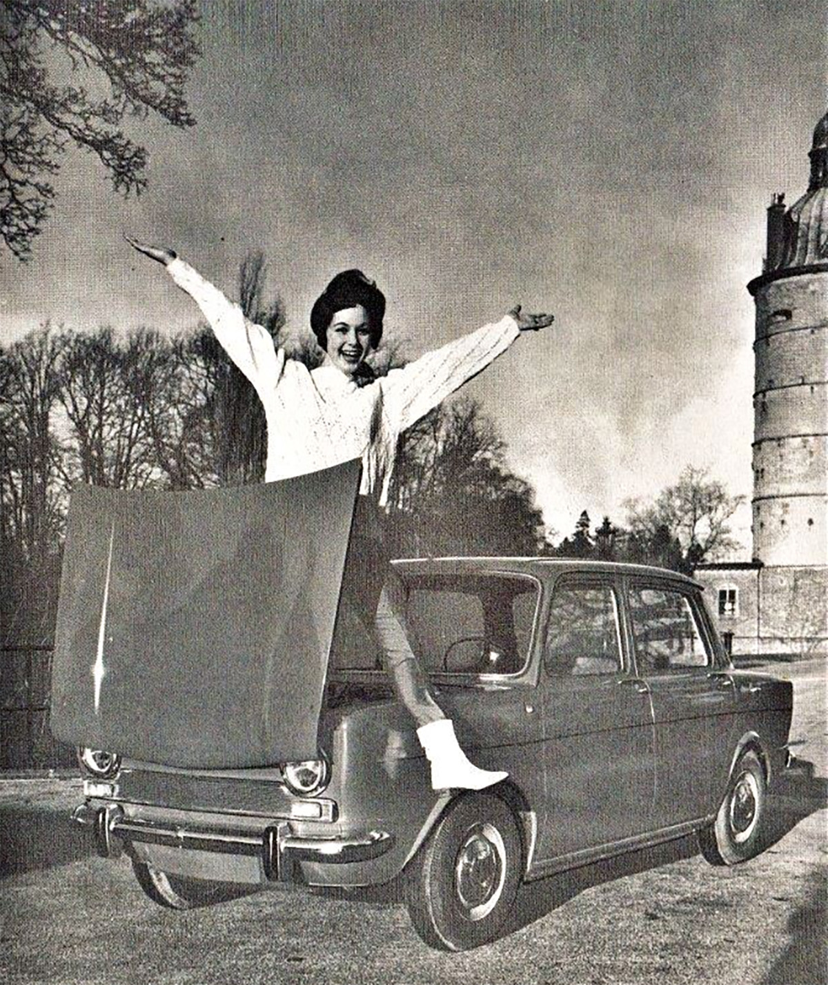 U svakom slučaju, Simca 1000 se definitivno uklapa u ovaj kalup. Kutijasti stil je značio da je prednji prtljažnik bio prilično prostran i za automobil te veličine, kao što je efektivno demonstrirano kako ova žena može na neki način da skakuće unutra.
