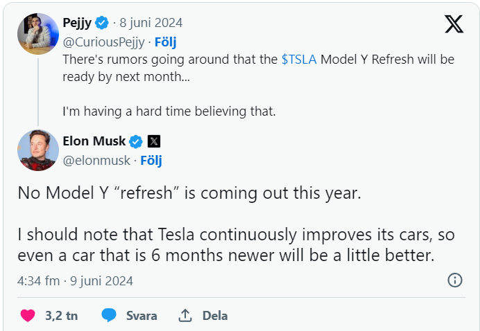 Informacije su se takođe brzo proširile u mnogim Teslinim grupama gde su se diskusije o kupovini vrtele oko toga da li treba čekati na ažurirani Model Y koji „dolazi za nekoliko meseci“. Takve rasprave su možda uticale na prodaju važnog modela, a sada je Ilon Mask odlučio da demantuje glasine preko platforme X.