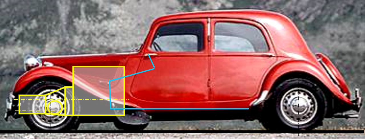 Traction Avant – Andre Citroen postavio je diferencijal izmedju kuplunga i menjaca, u zajednickom kucistu. Tako je rastojanje osovina smanjeno na razumnu meru.