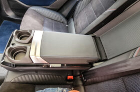 Samim tim oslobođen je prostor na panelu koji deli vozača od suvožača, gde se srećemo s jednom velikom ručkom, inspirisanom komadama u aeronautici (za gas u avionu). Ovde služi kao oslonac za šaku i pomera se po horizontali nekih dvadesetak santimetara, sa, na gornjem delu mestom za bežično punjenje smartfona.