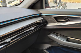 I zaista, sitnice za mogu odložiti na više zgodnih mesta, spomenuću samo velike pregrade na vratima, postavljene mekanom plavom tkaninom. Što se tiče opreme uglavnom je sve tu, čak i niži završni nivo (ponuđena su samo dva) poseduje navedene ekrane i „head up“ pokazivač od 9,3 inča, računajući i integrisanu satelitsku navigaciju Google Map.