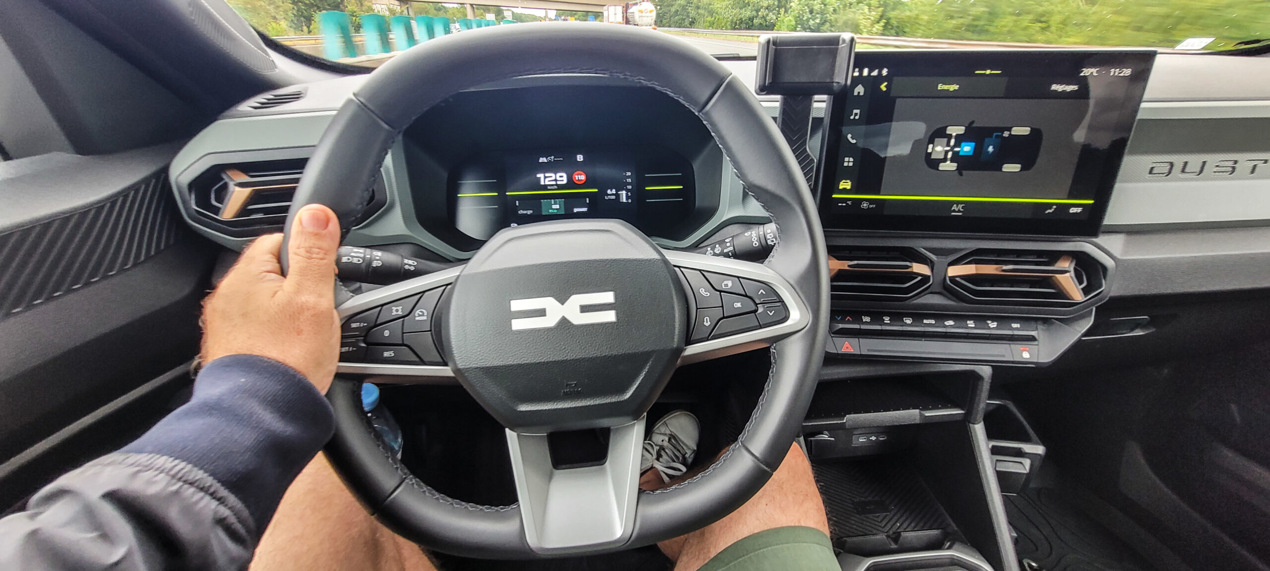 Praktični aspekt enterijera je za svaku pohvalu, impresioniraju ogromne police na vratima i pregredak za rukavice ispred suvozača, dok pri dnu centralne konzole pronazimo platformu za bežično punjenje smartfona. Bez obzira što je imao integrisanu satelitsku navigaciju, u voženom Dusteru predviđen je i podesiv držač za mobilni telefon, u zavisnosti od završnog nivoa uz doplatu.