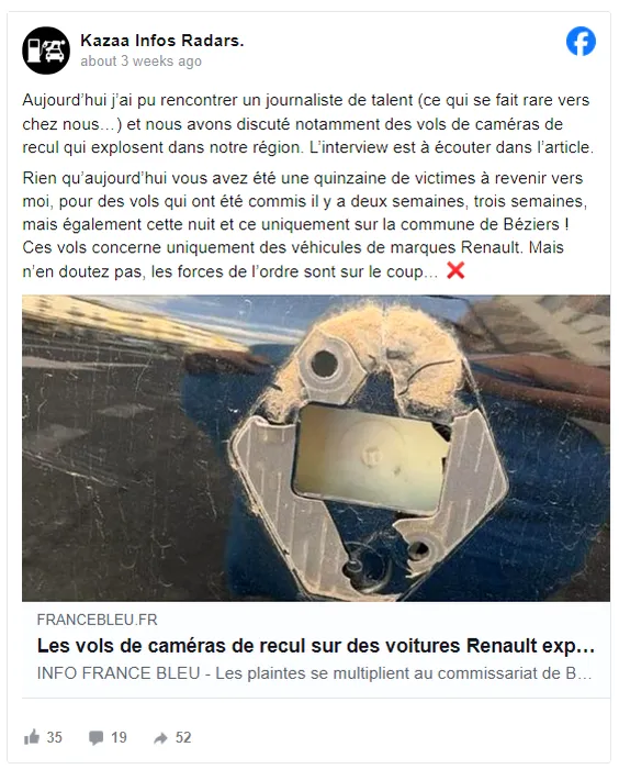 Reč je o pojavi koja se već nekoliko nedelja širi po celoj Francuskoj. Slučajevi su otkriveni u Bezijeru, Narbonu i Lionu. Na meti lopova su posebno Renaultovi modeli Clio, Megane i Captur. Zainteresovani su za kamere za vožnju unazad skrivene u dijamantskom logotipu brenda. Razlog bi bio taj što je ovaj komad lako ukrasti i preprodati. Zločincima je potrebno samo nekoliko minuta i jednostavan, običan šrafciger da ih uklone, što se može učiniti vrlo diskretno. Ponekad vlasnik ni ne shvata da automobil više nema ovaj deo.