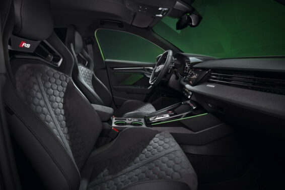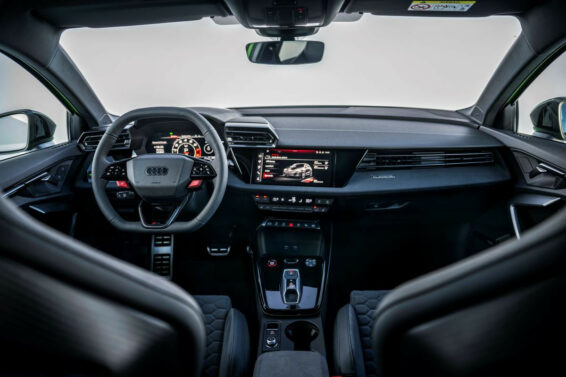 Glavna inovacija enterijera restilizovanog Audija RS 3 je trokraki volan, skraćen na vrhu i na dnu, sa velikim crvenim tasterima za izbor režima vožnje.