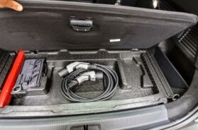 U dnu našeg nema prostora za rezervni točak, u njemu je uredno složen kabl za ugrađen punjač (ili pretvarač ukoliko više volite) od 7,4 KW (opcija, serijski je od 3,7 kW), dok je kabl za punjenje na kućnu utičnicu u za to predviđenoj torbi, koja realno smeta i zauzima korisan prostor.