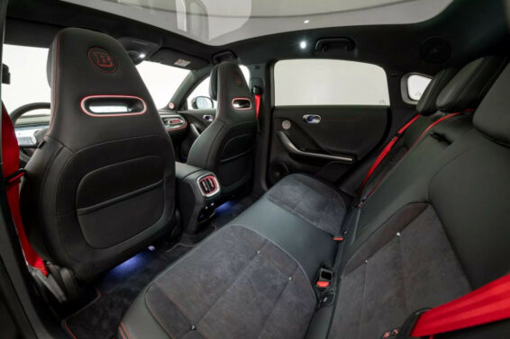 Unutrašnjost ima kombinovanu oblogu od kože, mikrovlakana i semiša, sa crvenim dekorom na instrument tabli i deflektorima za ventilaciju.