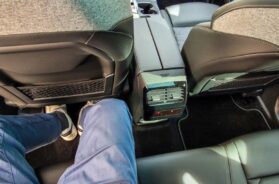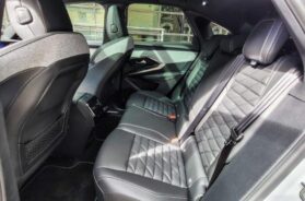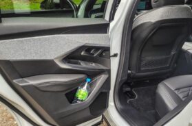 Tako dođosmo i do sedišta pozadi, nalazim da je prostor za putnike prosečan u segmentu, iako je međuosvinsko rastojanje veće za 6 cm u poređenju s prethodnim 3008. Nije dakle nikakva referenca u segmentu (VW ID.4 i Hyundai Ioniq 5 su prostraniji ali i duži), ima ga međutim sasvim dovoljno za dve prosečno visoke osobe, čak i za glave, uprkos zakošenom zadnjem staklu.