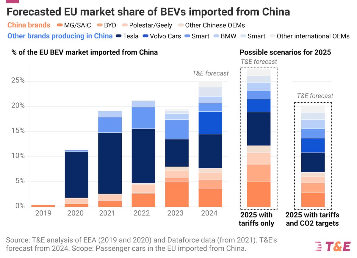 Neki proizvođači automobila izrazili su želju da EU sledeće godine smanji zahteve za emisiju štetnih gasova. Ali T&E se tada plaši da će to dovesti samo do toga da kineski električni automobili zadobiju sve veći tržišni udeo. Uprkos višim carinama, olakšani zahtevi su možda doveli do toga da Kina dostigne tržišni udeo od 27 odsto. To je zato što se od evropskih proizvođača automobila očekuje da smanje svoja ulaganja u električne automobile.