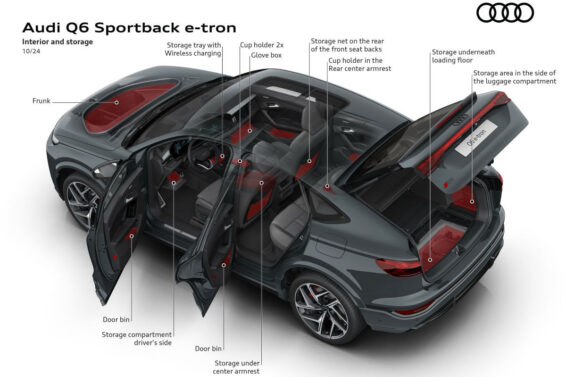 Posebna pažnja je posvećena očuvanju praktičnosti kupeolikog električnog SUV-a. Njegov prtljažni prostor ima kapacitet od 511 litara, a sa spuštenim zadnjim sedištima povećava se na 1.373 litra. Ovo je očekivano manje od kapaciteta osnovnog Q6 e-trona (526 litara i 1.529 litara respektivno).