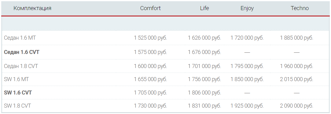Veste sa motorom od 106 KS i CVT menjačem nude se samo u osnovnim paketima opreme Comfort i Life, dok verzije sa motorom 1.8 zadržavaju kompletan asortiman od četiri nivoa opreme. Doplata za CVT menjač u odnosu na modele sa manuelnim menjačem iznosi 50 hiljada rubalja, dok su verzije sa motorom 1.8 skuplje samo 25 hiljada rubalja. Cenovnik za sedane i karavane sada izgleda ovako: