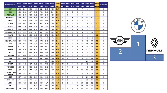 Prošle godine, anketa je stavila Hondu i Toyotu na vrh rang liste od 28 ispitanih marki, dok su Jaguar-Land Rover i Alfa Romeo zauzeli poslednja mesta. Rezultati za 2024. godinu donose značajno drugačiju sliku, budući da se BMW našao na prvom mestu sa ocenom 7,27 od 10, ispred sestrinskog brenda Mini i Renaulta, koji je dospeo na treće mesto, nakon što je u 2023. završio na petom. S druge strane, Honda je pretrpela veliki pad, spustivši se sa prvog na 19. mesto u roku od dvanaest meseci, sa ocenom od samo 4,5 od 10.