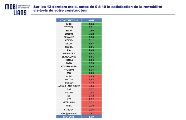 Zastupnici su pokazali sličnu strogost prema markama Stellantis grupe. Na pitanje: „Sve u svemu, i nakon razgovora koji smo upravo vodili, koju ocenu od 0 do 10 biste dali svom proizvođaču?“, Citroën je dobio poslednje mesto sa ocenom 3,5, Alfa Romeo je takođe na 3,5, dok je DS ocenjen sa 3,96/10.