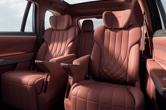 Drugi red sedišta čine dva luksuzne fotelje sa funkcijom „nulte gravitacije“, osloncem za noge i 18-tačkastom masažom. U naslonima prednjih sedišta nalaze se preklopni stočići, dok su u naslonima za ruke ugrađeni dodirni displeji za upravljanje električnim podešavanjima i drugim funkcijama. Čitav enterijer je presvučen prirodnom napa kožom, a vozilo ima ogromni panoramski krov.
