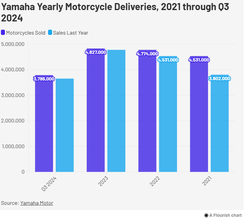Konstruktor je u prvih devet meseci tekuće godine, na tržištima širom Azije isporučio 2.931.000 motocikala, uz rast obima prodaje od jednog procenta (lani prodato 2.911.000 jedinica). Već drugo najveće tržište je potpuno minijaturno spram azijskog. Za Yamahu je to SAD gde je u analiziranom intervalu isporučeno „svega“ 68 hiljada vozila, uz 14% rasta u odnosu na 2023. kada je u prvih devet meseci ka kupcima otpremljeno 60 hiljada primeraka. Najmanje tržište Yamahe je matično gde je uz procenat pada isporučeno 54 hiljade dvotočkaša spram hiljadu više u lanjskom periodu.
