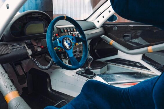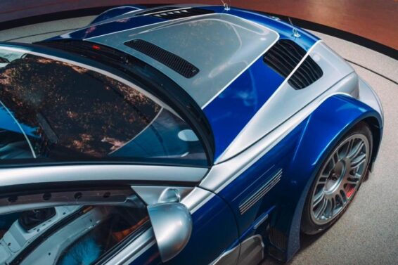 Prepoznatljiva po niskim pragovima, posebnim felnama, haubi sa otvorima i ogromnim zadnjim spojlerom tipičnim za trkačke modele, ova BMW M3 GTR nosi sivo-plavu šemu boja iz digitalnog originala. Osim što su verno preneli izgled, proizvođači su presvukli sedište i volan plavim Alcantarom kako bi sve bilo u skladu.