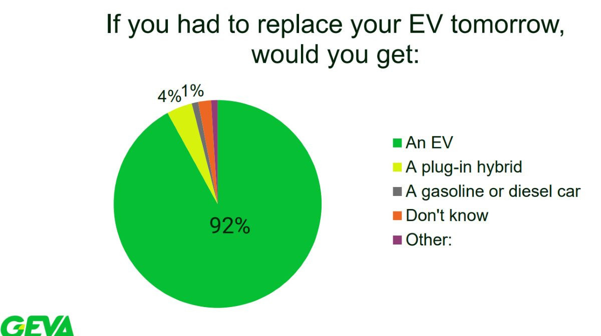 U istraživanju je učestvovalo 23.000 vlasnika električnih automobila iz 18 zemalja, uključujući SAD, Kanadu, Brazil, Indiju i nekoliko evropskih država. Na jednostavno pitanje: „Da li biste želeli da se vratite na automobile s motorima s unutrašnjim sagorevanjem?“, 92% ispitanika je odgovorilo odlučno „ne“. Još 4% izrazilo je želju da isproba hibridna vozila sa mogućnošću punjenja, dok se 3% nije opredelilo. Samo 1% učesnika ankete izjavilo je da bi ponovo želeli da voze automobil sa motorom SUS.