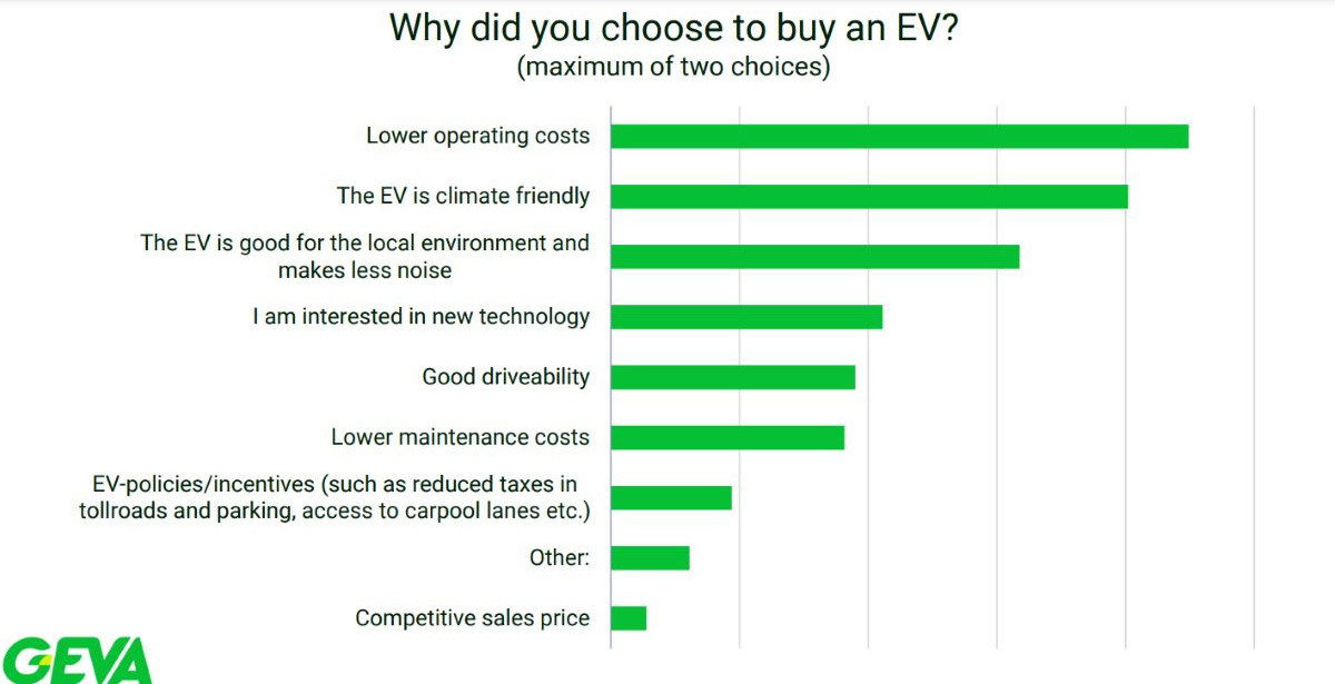Ispitanici su imali mogućnost da navedu dva glavna razloga za izbor električnih automobila. Rezultati pokazuju da su vlasnici bili pragmatični: