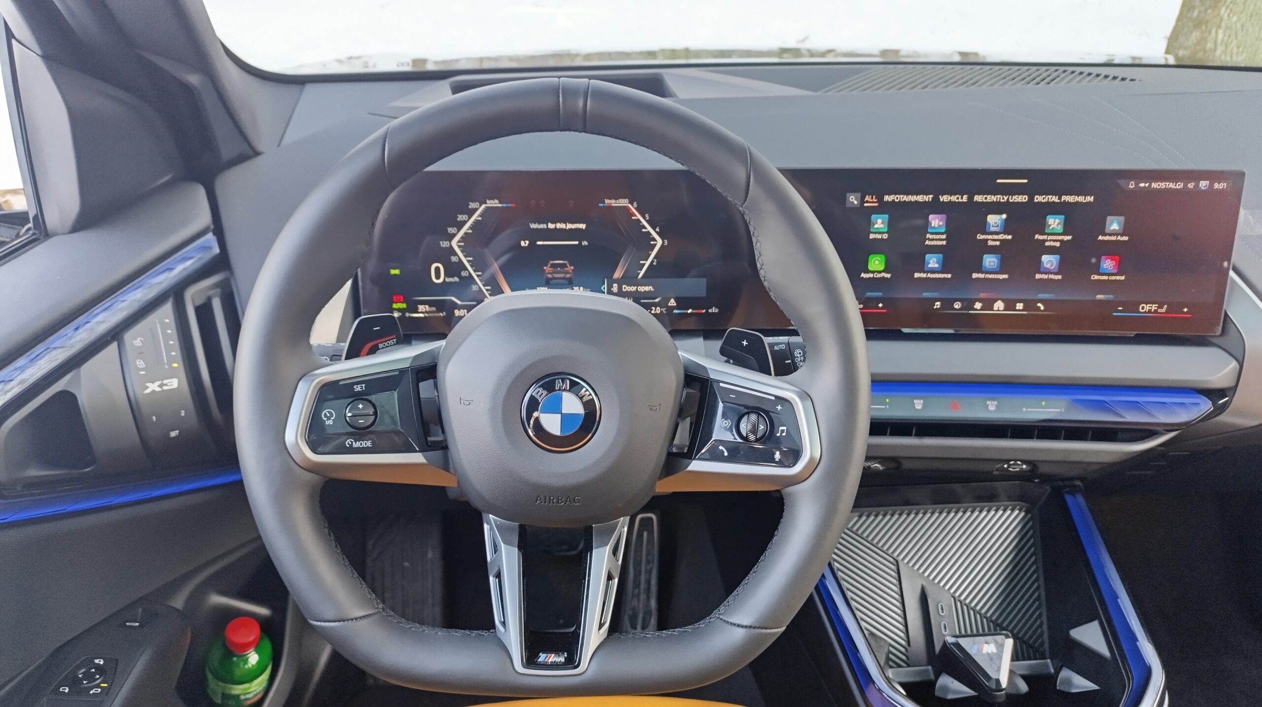 Novi X3 velikoj meri kopira enterijer ostalih novih (većih) modela BMW-a, što će reći da ispred vozača dominira veliki (dvodelni) zakrivljen ekran, s delom od 12,3 inča za instrumente, te drugim delom od 14,9 inča, koji je displej multimedijalnog sistema. Sistem se oslanja na operativni softver pod nazivom BMW OS 9.0, veoma je jasne grafike i velike brzine, a mogućnosti personalizacije su velike. I tek kada se upoznate sa ovim sistemom, shvatite koliko je onaj prethodni operativni sistem nekako baš „prevazidjen“ (nije on loš, ali, prosto, ovaj je mnogo, mnogo bolji).