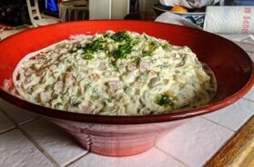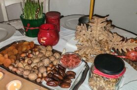 Prvi po gregorijanskom kalendaru uglavnom je u znaku poklona i poklončića, kao i raznovrsne hrane i pića. Za našom trpezom pronašli su se tako filovani avokado sa škampima, puževi, fuagra (jetra od tovljenih patki i guski), dimljeni losos i pečeni škampi (sve kao predjelo), dok je glavno jelo bio uštrojeni pevac, koji se samo za ovu priliku tovi najmanje 6 meseci.