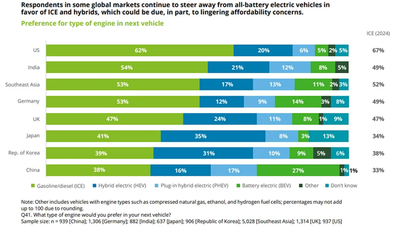 Interesovanje za vozila s motorima s unutrašnjim sagorevanjem poraslo je drugu godinu zaredom – 2023. godine taj procenat je iznosio 45%, dok je 2024. godine bio 49%. Istovremeno, električni automobili ostaju manje popularni: 14% ispitanika bi izabralo isključivo električno vozilo, što je samo jedan procentni poen više nego prethodne godine i isti rezultat kao 2023. godine. Plug-in hibridi i hibridna vozila privlače oko petinu ljudi (2024: takođe 21%).