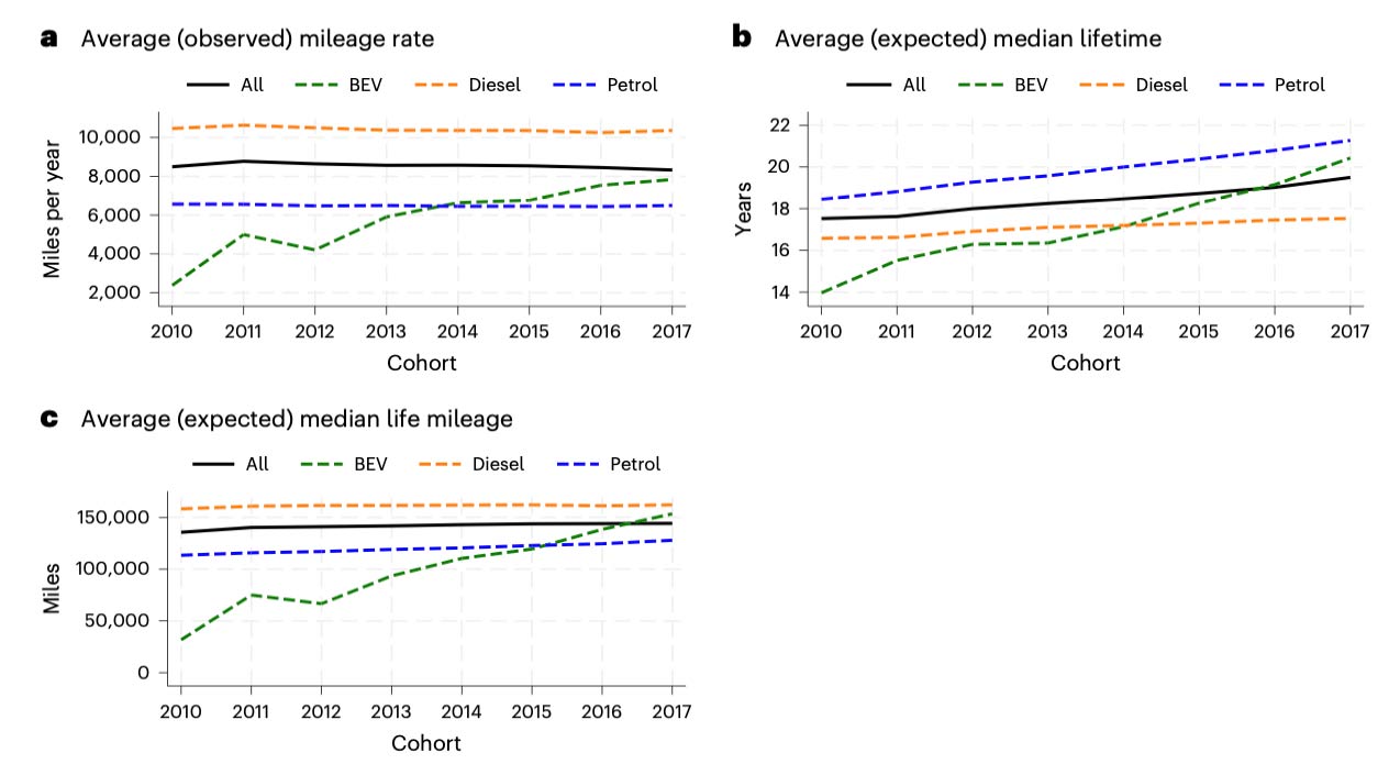 U naučnoj studiji objavljenoj u časopisu Nature je analiziran vek trajanja različitih marki i vrsta pogona koristeći podatke sa tehničkih pregleda vozila u Velikoj Britaniji. Istraživanje pokazuje da postoje razlike u prosečnom životnom veku vozila, ne samo između različitih vrsta pogona, već i među pojedinačnim proizvođačima. Jasno je da električni automobili brzo napreduju u pogledu dugotrajnosti.