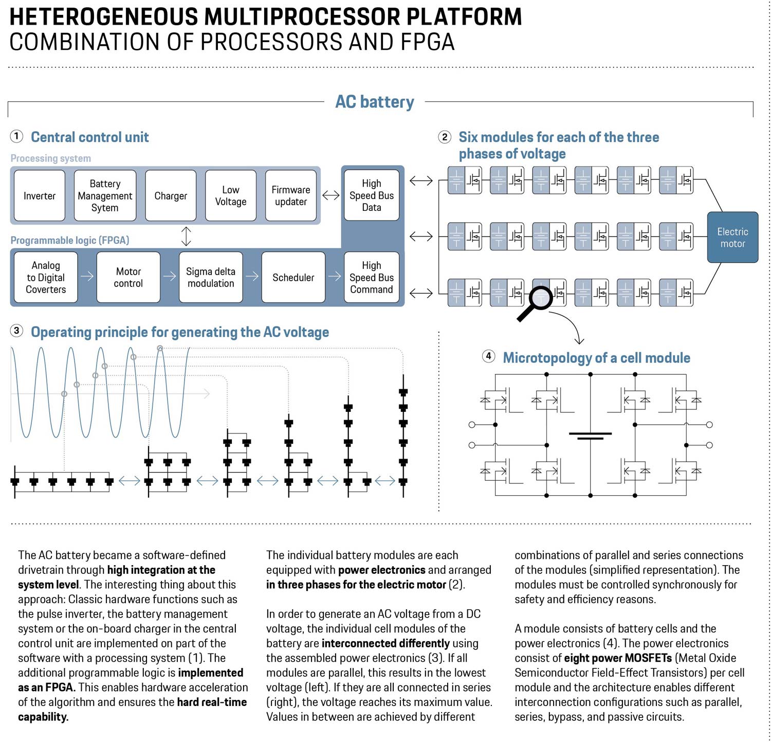U studiji izvodljivosti koju je sproveo Porsche Engineering, baterija je podeljena na 18 pojedinačnih modula, koji su raspoređeni na tri faze. Svakim modulom upravljaju tranzistori snage.