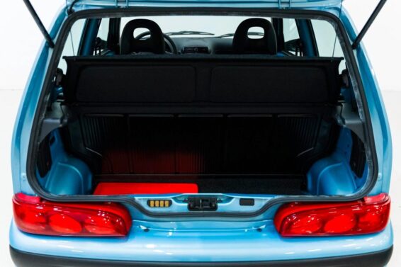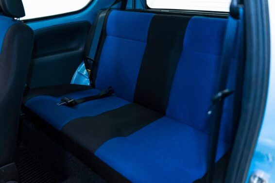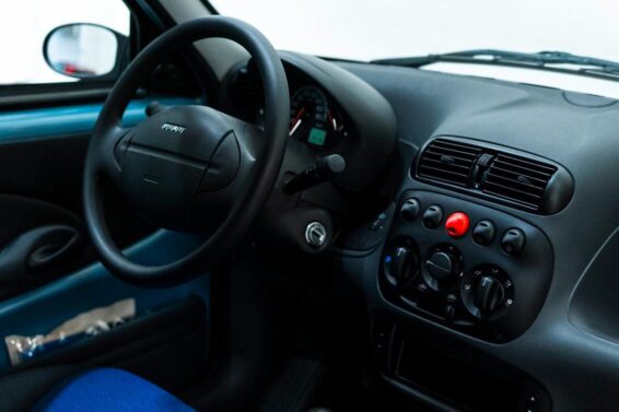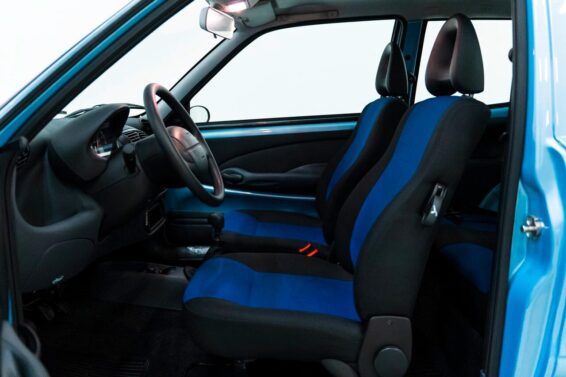 Reč je o „fazi 2“ iz 2002. godine, što se prepoznaje po okruglom Fiatovom logotipu koji je proizvođač tada ponovo uveo. Karoserija u svetloplavoj boji Azzurro Athena izgleda besprekorno. Unutrašnjost prati tu nijansu – tamno plava tkanina u kombinaciji s crnim elementima ne pokazuje nikakve znakove habanja. Plastični delovi nisu izbledeli, čak su i pedale neverovatno čiste (verujemo da vam deluju poznato – da, identične su kao na Yugu i Stojadinu).