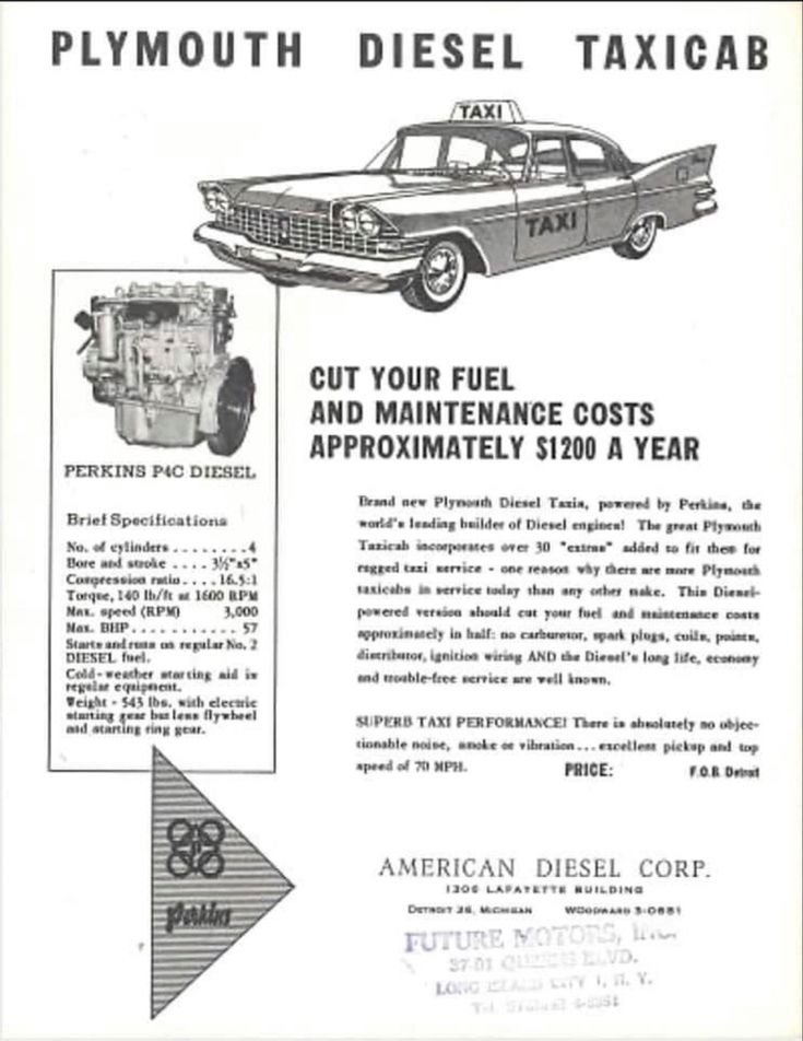 Ideja se zapravo nije rodila u Sjedinjenim Američkim Državama već u Belgiji gde je neko zaključio da bi dizel bio pristupačnija alternativa među taksi vozilima. Dizelaši su naravno bili veoma česti na evropskim putevima u spomenuto vreme, mada nam je nepoznato zašto bi neko na Starom kontinentu kupio Plymouth u vreme kada je još tekao oporavak od posledica Drugog svetskog rata.