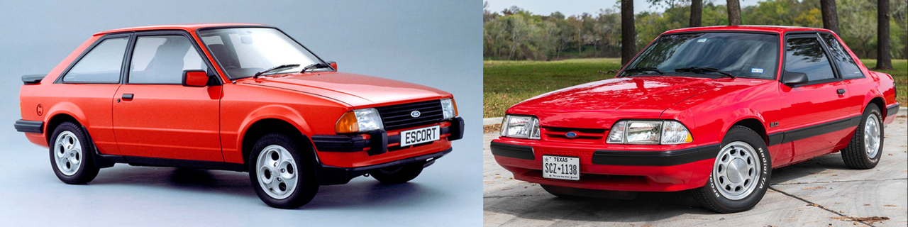 Da ne bude zabune: levo je Escort iz 1985 a desno Mustang iz 1990. To objasnjava ko je kome bio uzor! 🙂 Ostaje neobjasnjeno u cemu je bila tajna uspeha tadasnje generacije Mustanga?