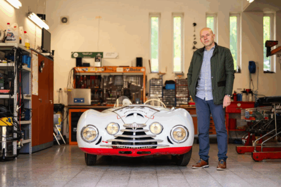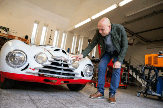Danijel Petr, autor vizije Škoda Sport LM 2025, stoji uz originalni trkački automobil Škoda Sport, koji je 1950. godine učestvovao na startu čuvene trke u Le Manu.