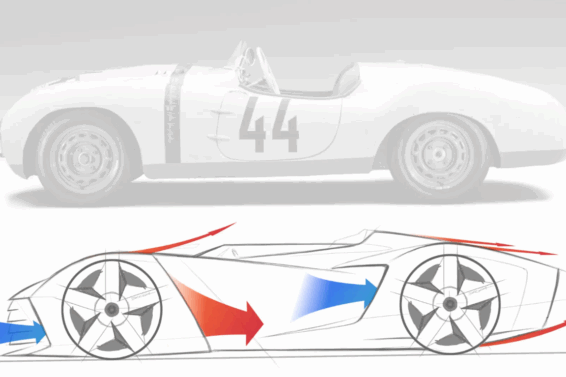 Još jedna karakteristika koja je preneta iz istorijskog originala jesu bočne linije vozila – pre svega izraženi i „mišićavi“ blatobrani, koji su se nekada ručno izrađivali udaranjem lima, što se i danas jasno vidi na originalnom trkačkom modelu.