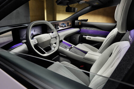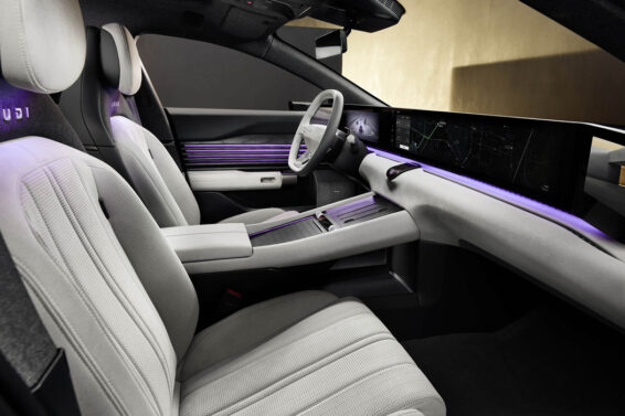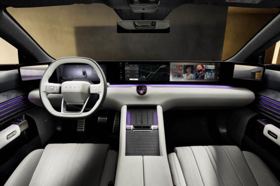 Unutrašnji dizajn nema nikakvu sličnost sa poznatim Audijevim modelima. Preko cele širine table nalaze se četiri ekrana: bočni prikazuju sliku kamera retrovizora, ispred vozača je instrument tabla od 12,3 inča, a centralni multimedijalni ekran ima dijagonalu 27 inča. Info-zabavni sistem pokreće savremeni čip Qualcomm Snapdragon 8295 i sistem AUDI OS na platformi Volcano, uz veštačku inteligenciju i glasovnog asistenta, za kojeg je čak predviđen poseban mali displej u sredini konzole.