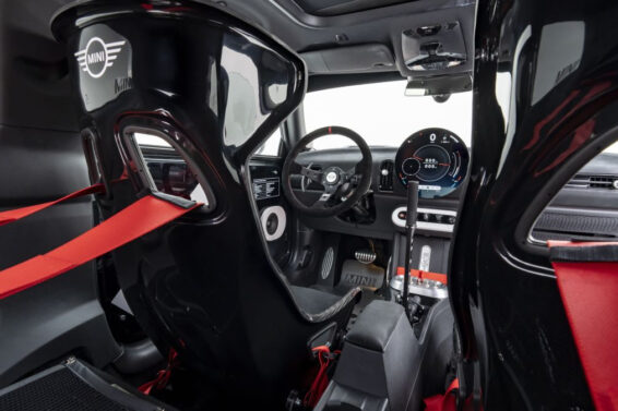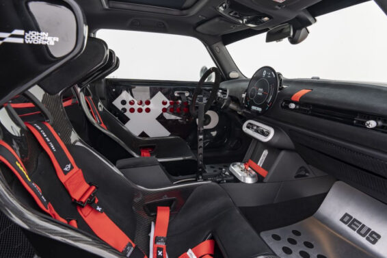 Unutrašnjost je takođe doterana po sportskim standardima, a glavna karakteristika je integrisani bezbednosni kavez. Ugrađena su trkačka sedišta sa sigurnosnim pojasevima u pet tačaka. Standardni volan zamenjen je sportskim s oznakom nultog položaja. Pored visokog ručne kočnice nalazi se novi blok mehaničkih prekidača. Radi smanjenja mase uklonjen je veći deo standardne unutrašnje obloge i zadnja sedišta. Ni ovde tehničkih promena nema: verzija JCW i dalje koristi poznati dvolitarski turbomotor (231 KS, 380 Nm) i sedmostepeni robotizovani menjač s dve spojnice.