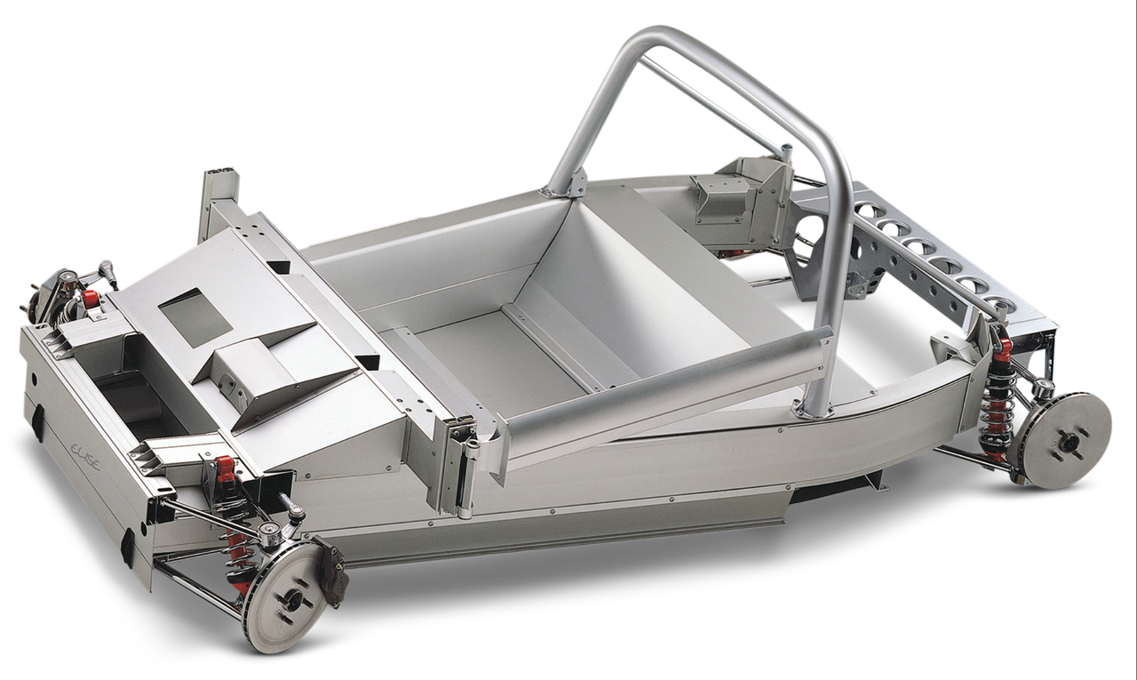 Za poredjenje – na donjoj slici je noseca struktura Lotusa Elise. Sastoji se od aluminijuma – delovi od secenog aluminijumskog lima, spojeni zakivcima i lepkom, plus nekoliko ojacanja od vucenih al-profila. To je sve. Svaki masinbravar moze ovo kod kuce da napravi! Preko ove strukture montirani su delovi spoljasnje oplate od staklenih vlakana. Niska cena proizvodnje i dobar balans tezina – snaga omogucio je Elisu da dugo zivi! To je prava poslovna strategija a ne Alfin ekzibicionizam sa preskupom tehnologijom.