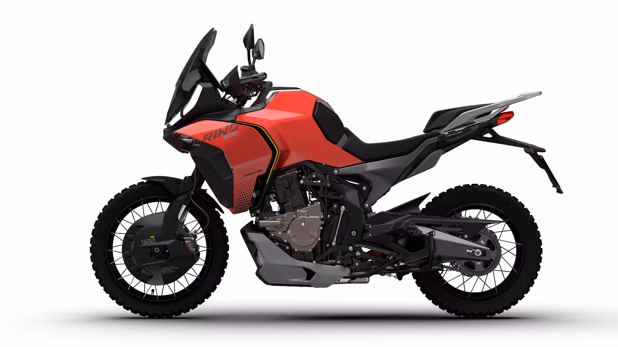 Točkovi na QJMotor Rino 900 ADV, očigledno s felnama u tipičnim dimenzijama za avanturističke putne modele od 19 inča napred i 17 inča pozadi, poseduju dizajn s ukrštenim žicama, dok su gume lišene prisustva unutrašnje. Prve slike takođe prikazuju bočno postolje (takozvanu ćopavu), centralno postolje (štender takoreći) i velikodušno dimenzionisanu zaštitu motora. Ostale standardne karakteristike ovog QJMotora uključuju ekran tipa TFT, mogućnost povezivanja s pametnim telefonom, tempomat, grejane rukohvate, pa čak i grejano sedište.