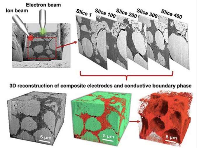 Sintetičke faze granica, prikazane crvenom bojom na modelu, formiraju unutrašnju mrežu kroz celu elektrodu, koja olakšava brzo kretanje čestica i efikasniji transport naboja.