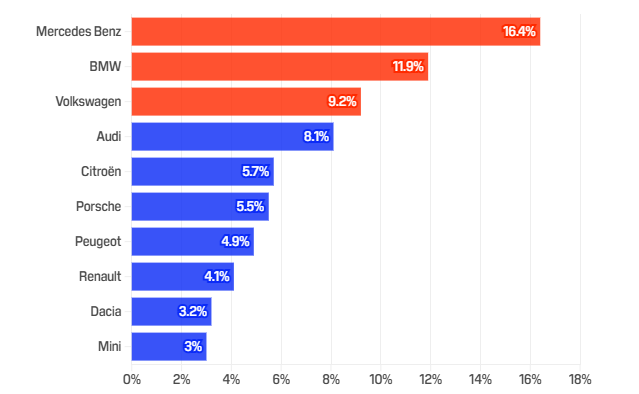 Francuske marke Citroën (5,7%), Peugeot (4,9%), Renault (4,1%), kao i Dacia (3,2%) i Mini (3%), zaokružuju listu najvećih „doprinosilaca“.