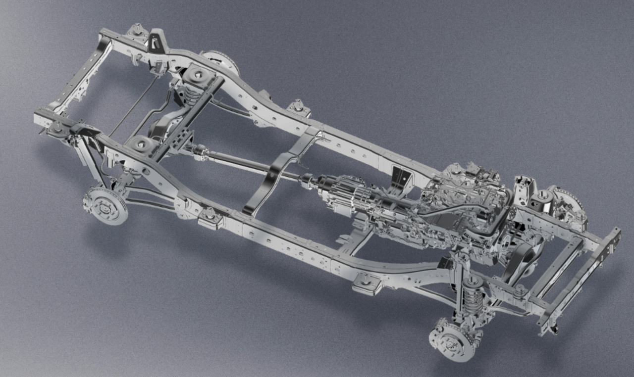 Sasija, dve krute osovine, motor u centralnoj poziciji.