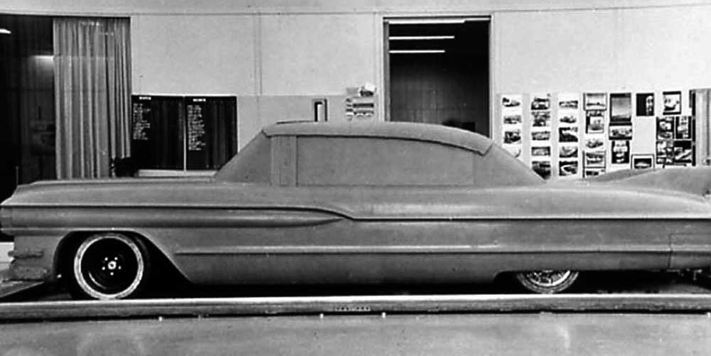 Ovo je originalno planirani 1959 Cadillac. Vidi se da je trebao da ima dosta manje hroma i dosta manji rep. Ali kada su slike 1957 Chryslera izasle u javnost (a 1959 Cadillac je bas u to vreme bio u zavrsnim procesima razvoja), odluka je pala brze-bolje da se doda dosta hroma i ugradi jos veci rep, postu su takvi detalji u to vreme oznacali luksuz.