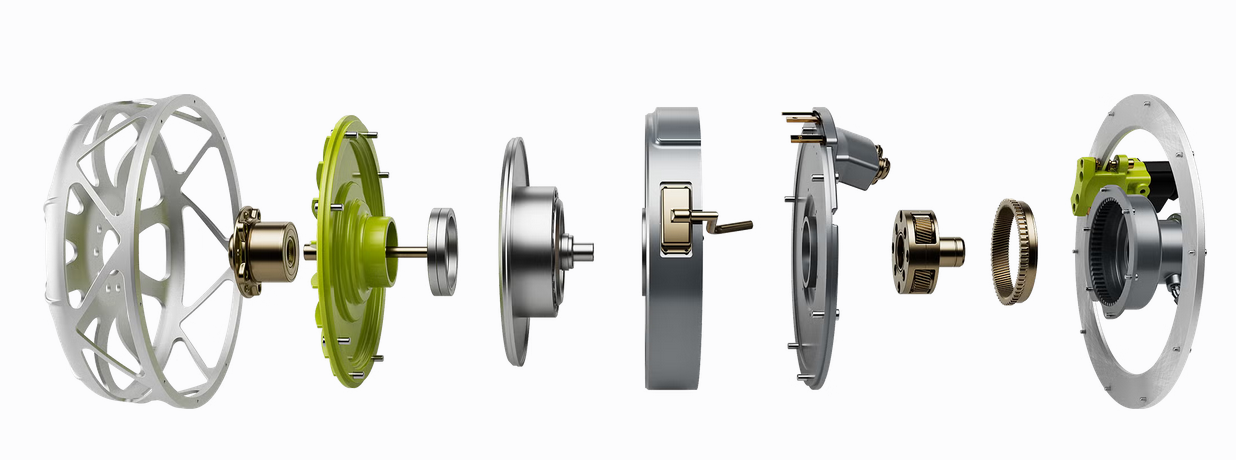 Na gornjoj slici je motor sa aksijalnim fluksom koji sadrži disk kočnicu sa unutrašnjim zahvatom čeljusti – sasvim desno.