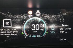 Pored upravljača uočih i dve ručice koje ne služe za menjanje brzina kao kod termičke verzije, već se njima podešava kočenje motorom, odnosno rekuperiranje energije. Predviđena su tri nivoa, ne i sistem „jedne papučice“, iako snažno usporava, na kraju se ipak mora posužiti kočnicom da bi se zaustavilo.