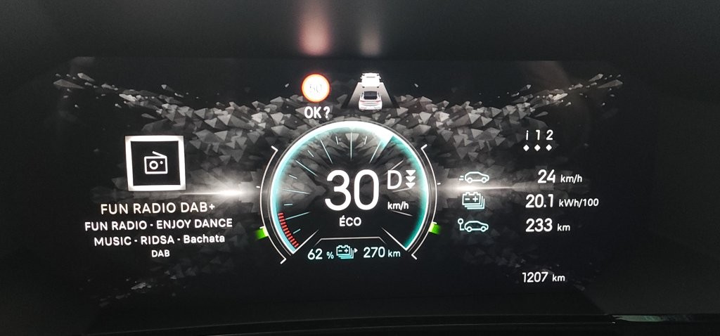 Pored upravljača uočih i dve ručice koje ne služe za menjanje brzina kao kod termičke verzije, već se njima podešava kočenje motorom, odnosno rekuperiranje energije. Predviđena su tri nivoa, ne i sistem „jedne papučice“, iako snažno usporava, na kraju se ipak mora posužiti kočnicom da bi se zaustavilo.