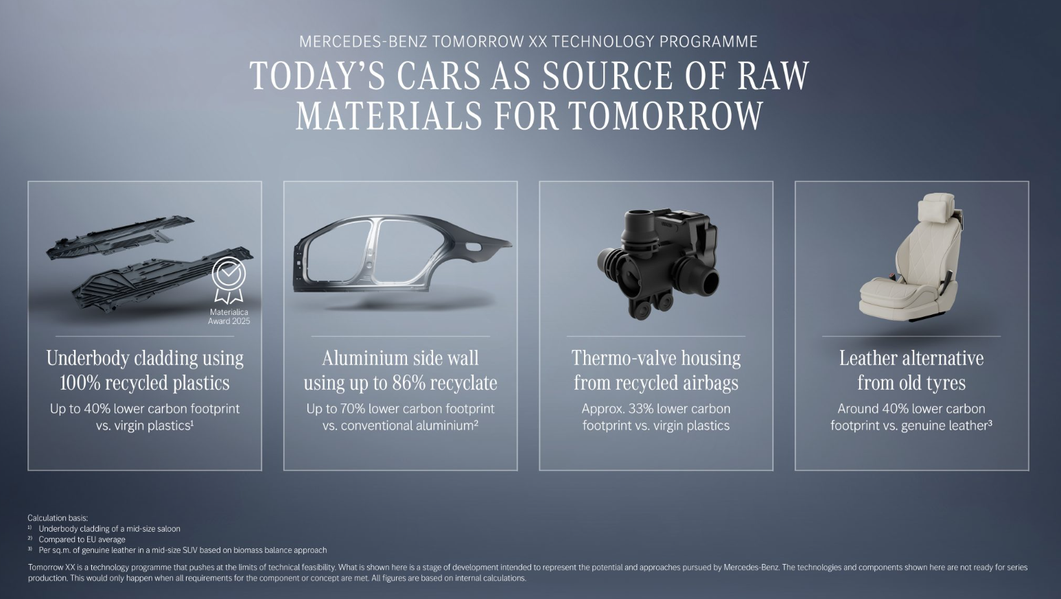 Kompanija je već, tokom otprilike dve godine rada na programu Tomorrow XX, identifikovala više od 40 novih, održivijih komponenti i materijala. Zajedno, oni imaju potencijal da značajno smanje ugljenični otisak budućih serijskih vozila u poređenju sa postojećim portfoliom, kao i da znatno povećaju udeo recikliranih materijala. Mere obuhvataju ne samo nove materijale, već i optimizovane proizvodne cikluse. Razvoj novih koncepata sproveden je uz strogo poštovanje Mercedes-Benzovih standarda kvaliteta, dizajna i komfora. Cilj je dosledna implementacija održivosti – od ideja u ranoj fazi razvoja, preko rešenja bliskih serijskoj proizvodnji, do inovacija koje su već uvedene u aktuelnu proizvodnju.